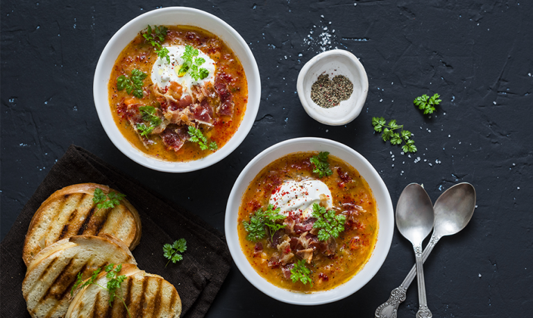 Lins- och Baconsoppa med Rostat Bröd och Smält Ost: En Hjärtlig Måltid för Alla