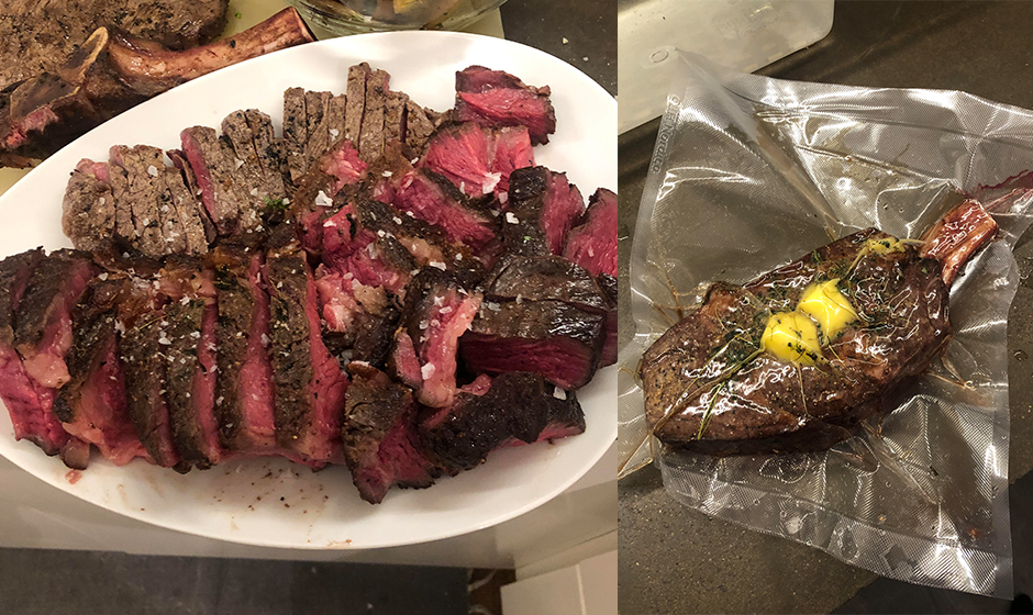 Lyft sedan köttet från värmen och förflytta köttet till en vaccumpåse. Innan ni lägger i köttet ge det ytterligare ett par vrid med pepparkvarnen, vitlökspulver samt salta. Lägg sedan en liten klick smör och timjankvist på toppen och vacuumförpacka köttet. Sedan räknar man med 1 timmes tillagningstid per 2.5 cm kött. Så är biten 5c = 2h i badet.