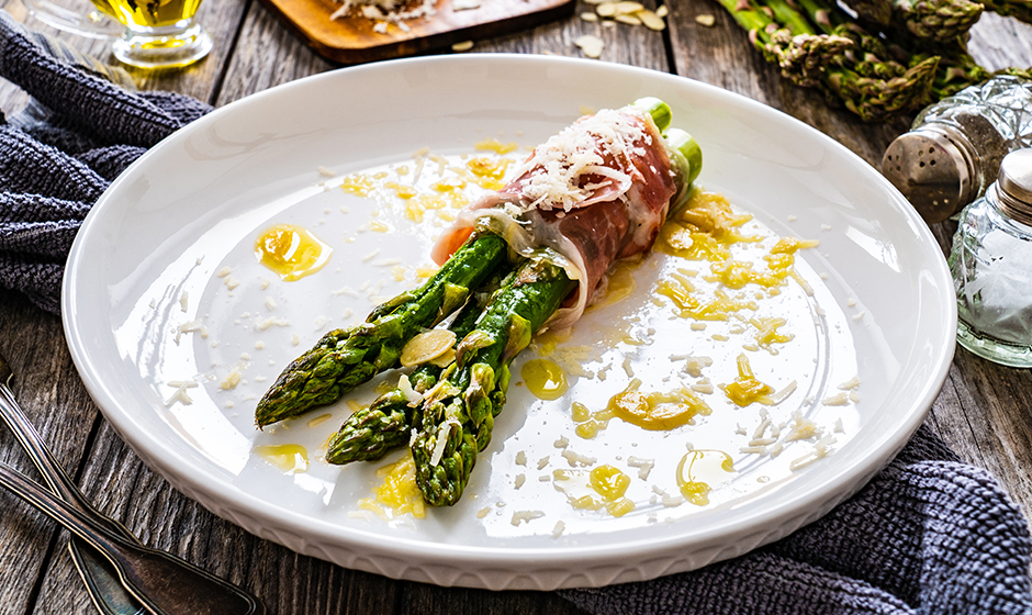 4. Gratinera sparrisen i en förvärmd ugn på 200 grader i 5-7 minuter tills prosciutton är knaprig och parmesanen är smält och gyllenbrun.