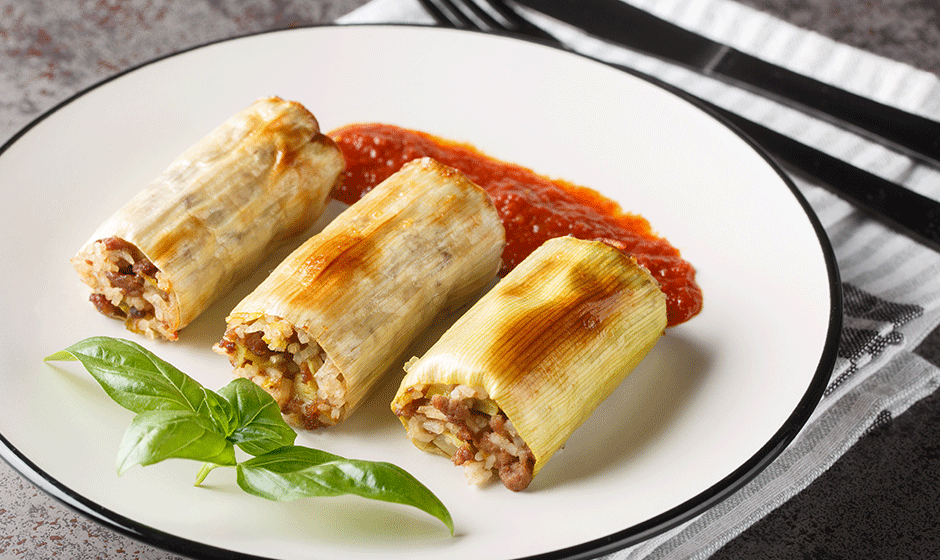 - Fyllning: Värm lite olja i en stor panna. Tillsätt vitlök och stek tills den är doftande. Lägg till köttfärsen och bryn tills den är genomstekt. Tillsätt morot, paprika och zucchini. Stek tills grönsakerna är mjuka. Blanda i det kokta riset, hälften av osten, ägg, salt, peppar och kryddor. Rör om ordentligt.