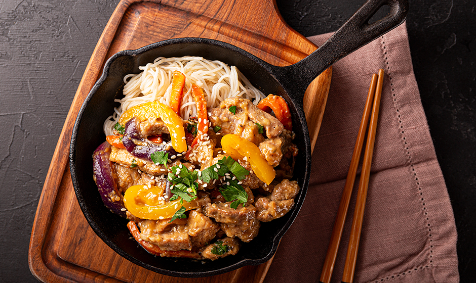 Detta recept för asiatiskt fläskkött med glasnudlar är en smakrik och färgglad måltid som kombinerar mört, stekt fläskkött med krispiga grönsaker och mjuka glasnudlar. De söta och syrliga paprikorna adderar en härlig kontrast till det kryddiga fläskköttet, medan rödlöken och vitlöken bidrar med djup och aromatisk smak. Ingefäran och chiliflakesen ger en välkommen värme och kryddighet, och såsens umami från soja och ostronsås binder samman alla smaker. Toppad med fräsch koriander och strössel av sesamfrön, är detta en rätt som är lika tilltalande för ögat som för gommen.