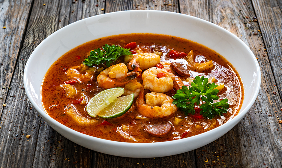 Louisiana Gumbo är en hjärtlig och kryddig soppa som är djupt rotad i södra USA:s matkultur. Detta recept kombinerar saftiga räkor och smakrik chorizo med klassiska gumbo-ingredienser som roux, cajunkryddor och färska grönsaker. Serverad med vit ris och en klyfta lime, erbjuder denna måltid en perfekt balans mellan hetta och komfort, och är en autentisk smakupplevelse av New Orleans kök.