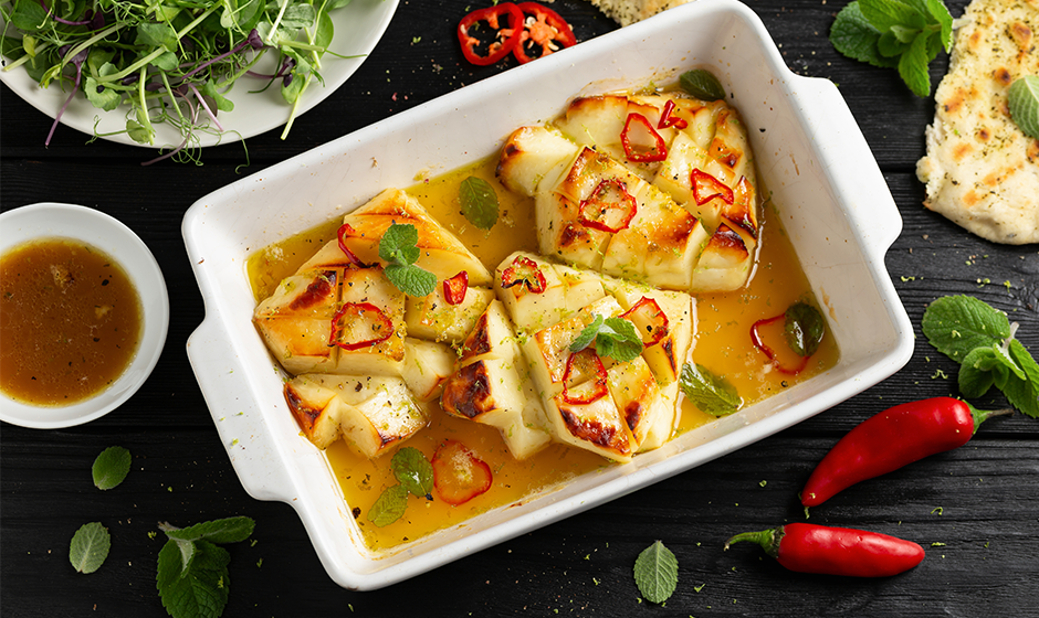 - Skär halloumin i skivor eller stora tärningar och placera dem i en ugnsfast form.