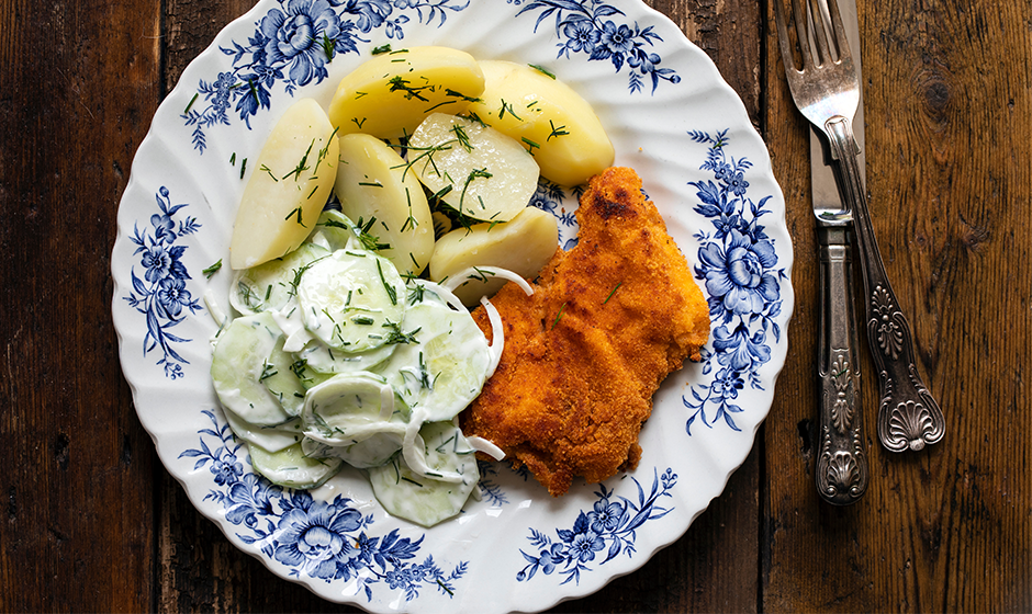 Panerad kyckling med färskpotatis och krämig gurksallad