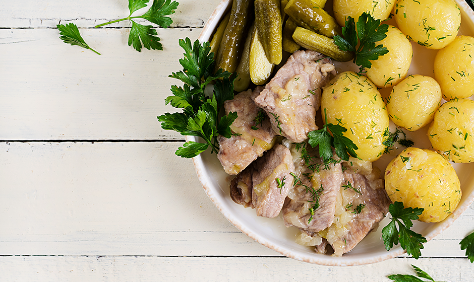 Kokt potatis med grytkokt fläskkött och saltgurka