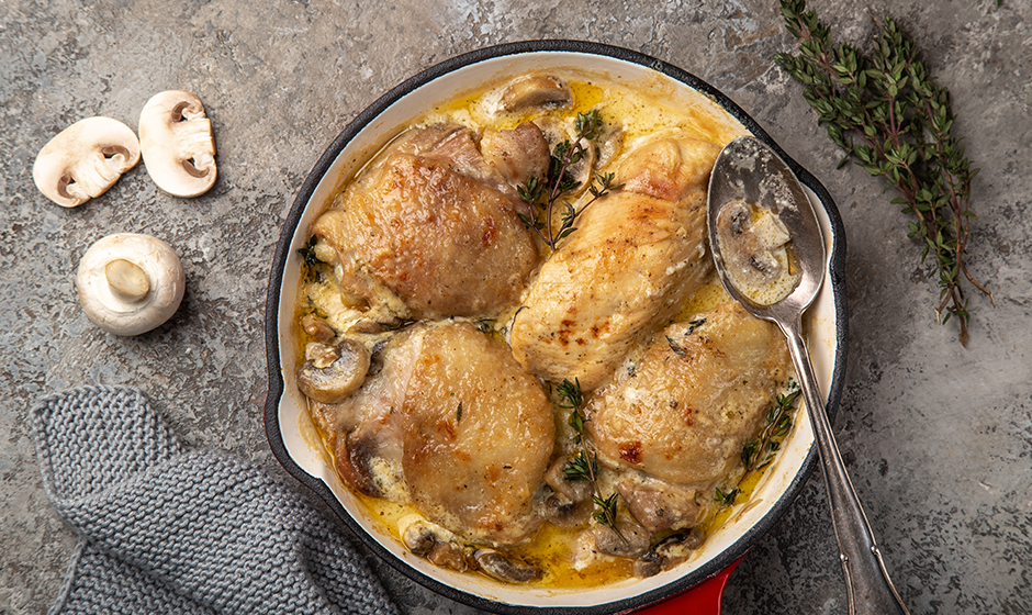 Saftig kyckling som får puttra i en len gräddsås med vitlök, champinjoner och färsk timjan. En rätt som känns lyxig utan att vara svår – perfekt till helgen eller när du vill bjuda på något extra.