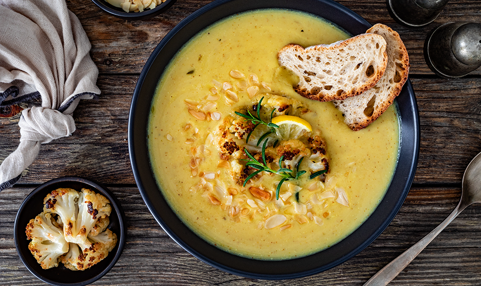 En len och krämig blomkålssoppa med djup smak från rostad blomkål, rundad med grädde och toppad med rostade mandlar och en hint av citron. En elegant men lättlagad grönsakssoppa där sötma, sälta och syra möts i perfekt balans – och som verkligen kommer till sin rätt tillsammans med ett aromatiskt men friskt vitt vin.