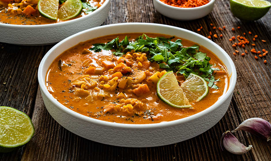 Krämig linssoppa med sötpotatis, kokosmjölk och lime