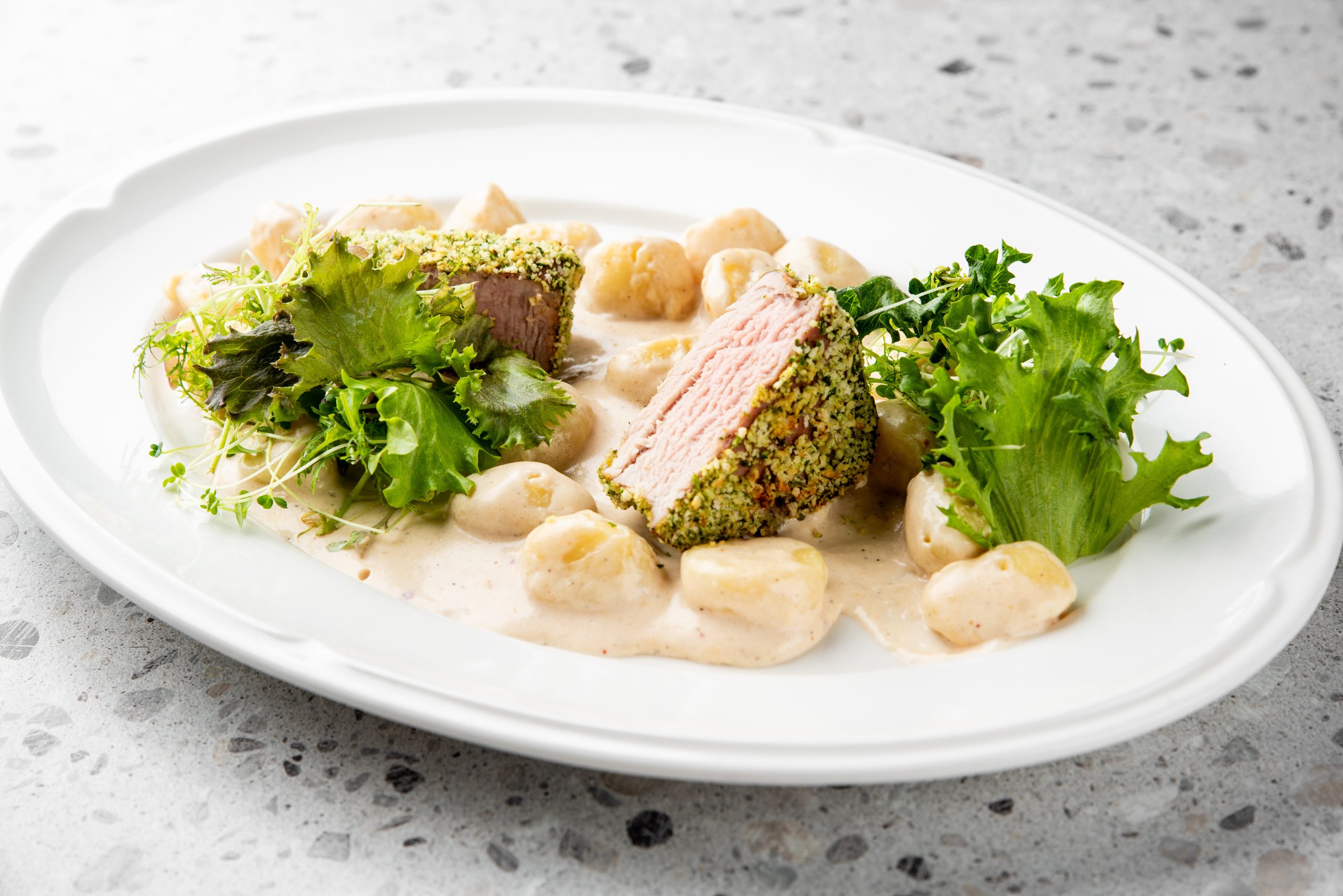 Örtbakad fläskfilé med potatisgnocchi, krämig sås och gröna blad