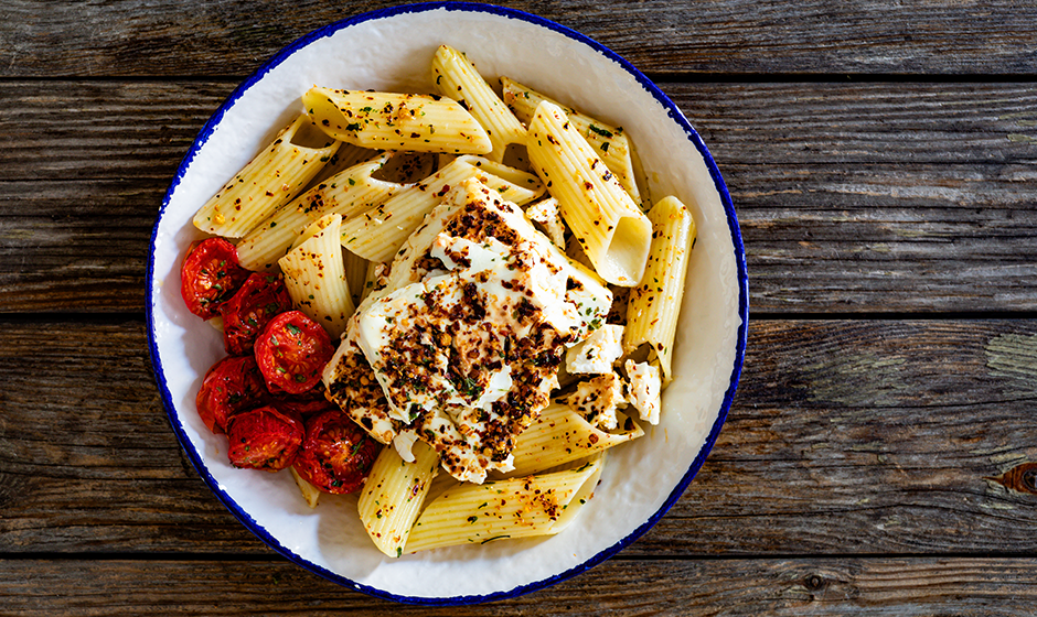 Penne med rostade körsbärstomater och bakad fetaost