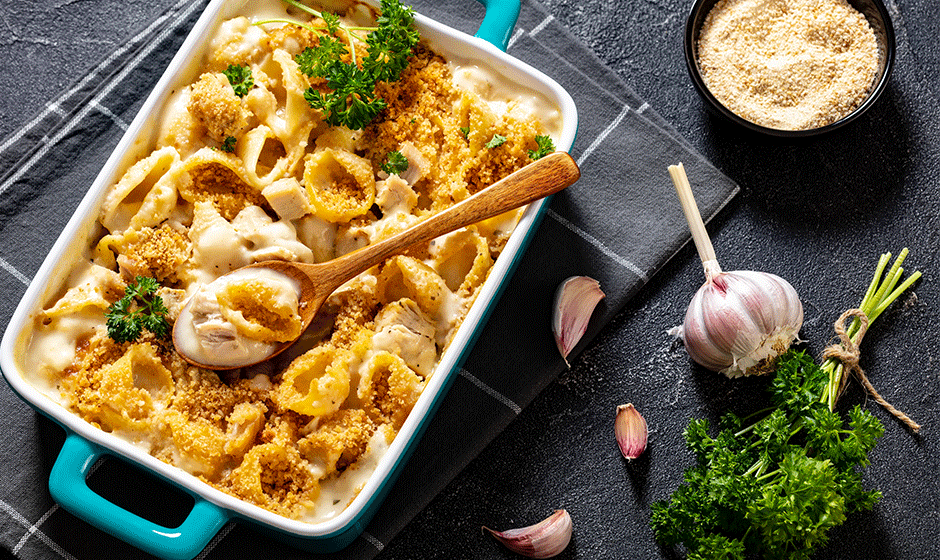 Den här krämiga kycklingpastan i ugn är den perfekta kombinationen av vardagsmat och lyx. Saftig kyckling, al dente pasta och en len gräddsås med vitlök och parmesan toppas med ett gyllene, krispigt täcke. En riktig familjefavorit som är enkel att laga men smakar som på restaurang – och som dessutom passar perfekt till ett glas Villa Brichot.