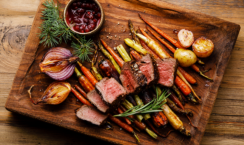 Grillad hjortstek med primörer, ugnsbakade grönsaker och bärsås