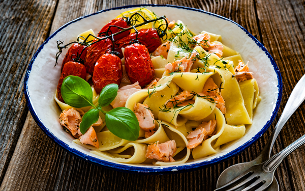 Pasta med ugnsbakad lax, rostade körsbärstomater och dill