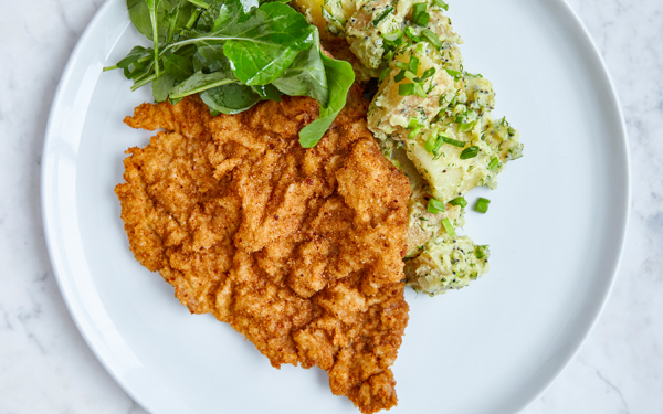 Klassisk fläskschnitzel med krispig panering, serverad med fräsch potatissallad och ruccola. En rätt som kombinerar sälta, syra och fräschör – perfekt till ett friskt och aromatiskt vitt vin som Mooi…