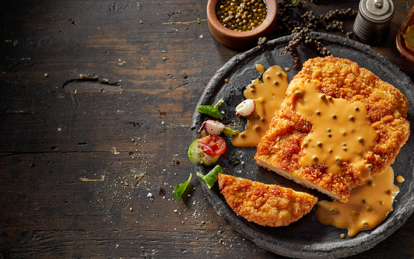 En klassisk schnitzel med en liten twist – här får den sällskap av en smakrik pepparsås och rostad potatis som tillsammans lyfter vinets frukt och kryddighet. Kombinationen av krispig panering,…
