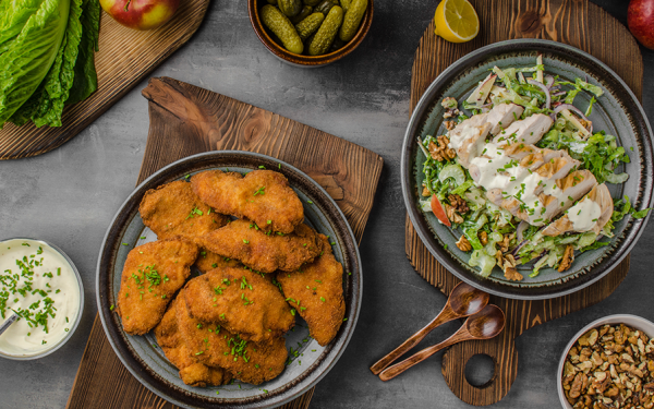 En riktig klassiker i ny tappning! Krispig, gyllene schnitzel serverad med en fräsch och krämig Waldorfsallad på äpple, selleri, valnötter och romansallad. Kombinationen av sälta, sötma och syra blir perfekt…