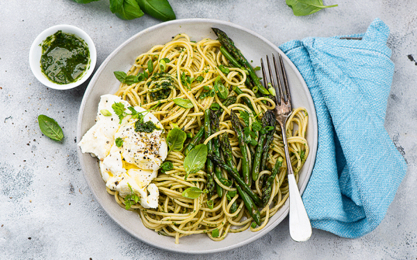 En grön och smakrik pastarätt med sparris, basilkapesto och krämig burrata. Perfekt när du vill laga något enkelt, elegant och riktigt gott till ett friskt mousserande vin.