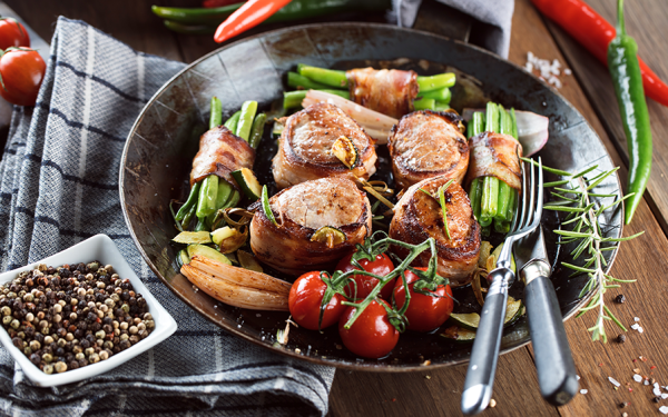 Fläskfilé i baconmantel med gröna bönor och ugnsbakade tomater – en klassisk gourmeträtt som blir komplett tillsammans med Les Pious Côtes du Rhône från Vinia.