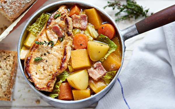 En rustik gryta på fläskkött, cider och rotfrukter. Mustig höstmat som blir extra god med Pont de Brion Graves Blanc från Bordeaux.