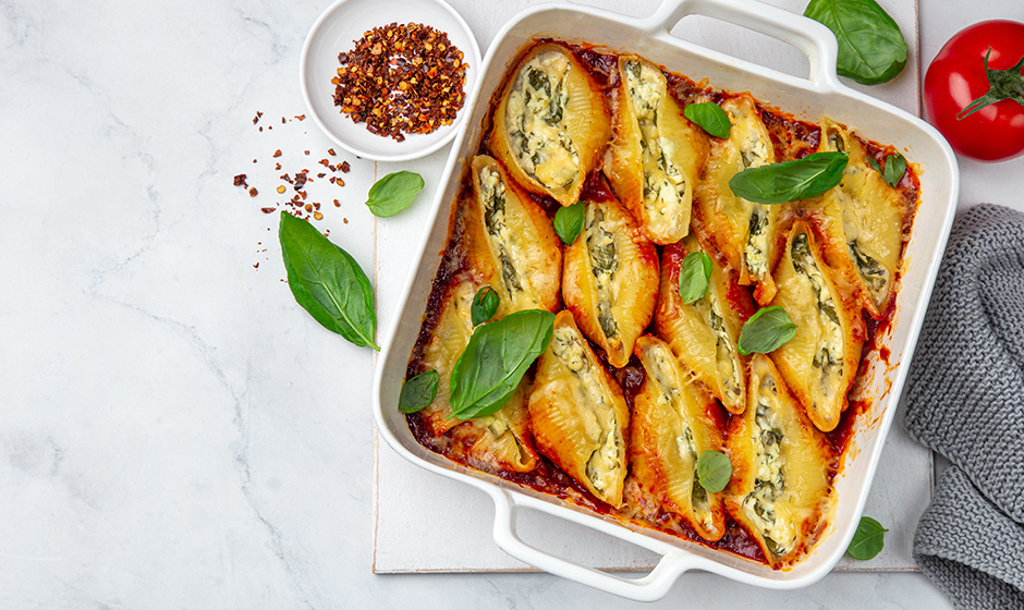 Pastasnäckor fyllda med len ricotta och spenat gratineras till perfektion i en rik tomatsås. En rätt som andas italiensk hemtrevnad och lyx i ett – särskilt när den serveras med ett glas sprudlande LXRY som tillför frisk balans.