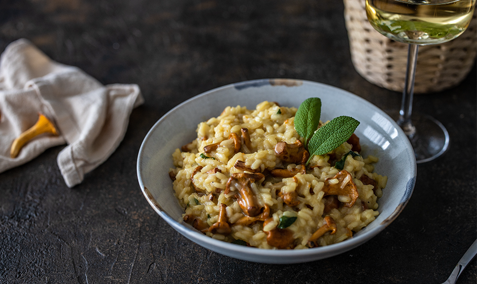Krämig risotto med gyllene kantareller och aromatisk salvia – en smakrik hyllning till det mörkare halvåret. Rättens lena konsistens och jordiga toner balanserad perfekt av den friska elegansen