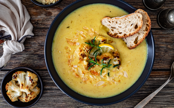 En len och krämig blomkålssoppa med djup smak från rostad blomkål, rundad med grädde och toppad med rostade mandlar och en hint av citron. En elegant men lättlagad grönsakssoppa där…