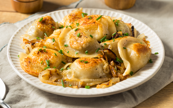 En klassisk polsk rätt där piroger fylls med potatis, lök och färskost, kokas och sedan steks gyllene i smör. Mjuk insida, krispig yta – underbart med ett glas Les Pious…