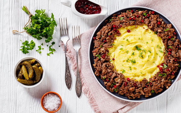 En klassisk norrländsk vinterrätt där tunt skivat renskav får sjuda i en mustig, krämig sås med svamp och lök. Serveras med lent potatismos, syrliga lingon och saltgurka – perfekt comfort…