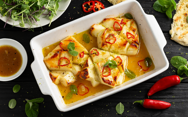 Instruktioner: Förvärm ugnen till 200°C. Skär halloumin i skivor eller stora tärningar och placera dem i en ugnsfast form. Ringla honung över halloumin och strö över chiliflakes. Se till att…